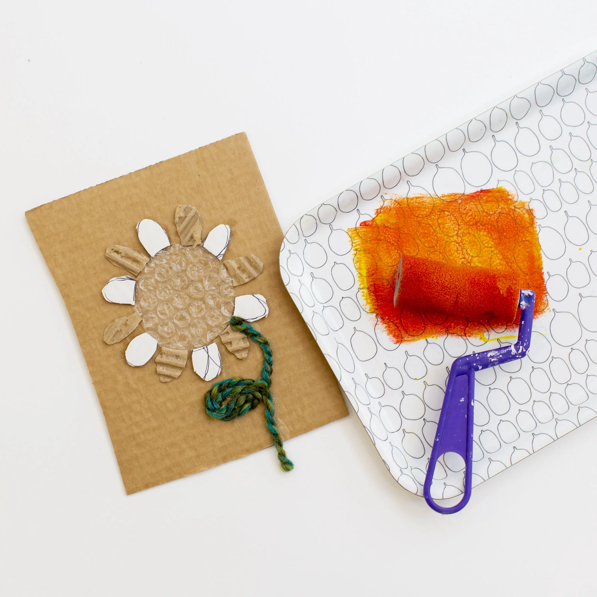 1. Collect recycled materials from around your house. Glue down a variety of materials (and textures) to a piece of cardboard. We love to use bubble wrap, thick yarn and bumpy/smooth papers. Think about creating a collage!