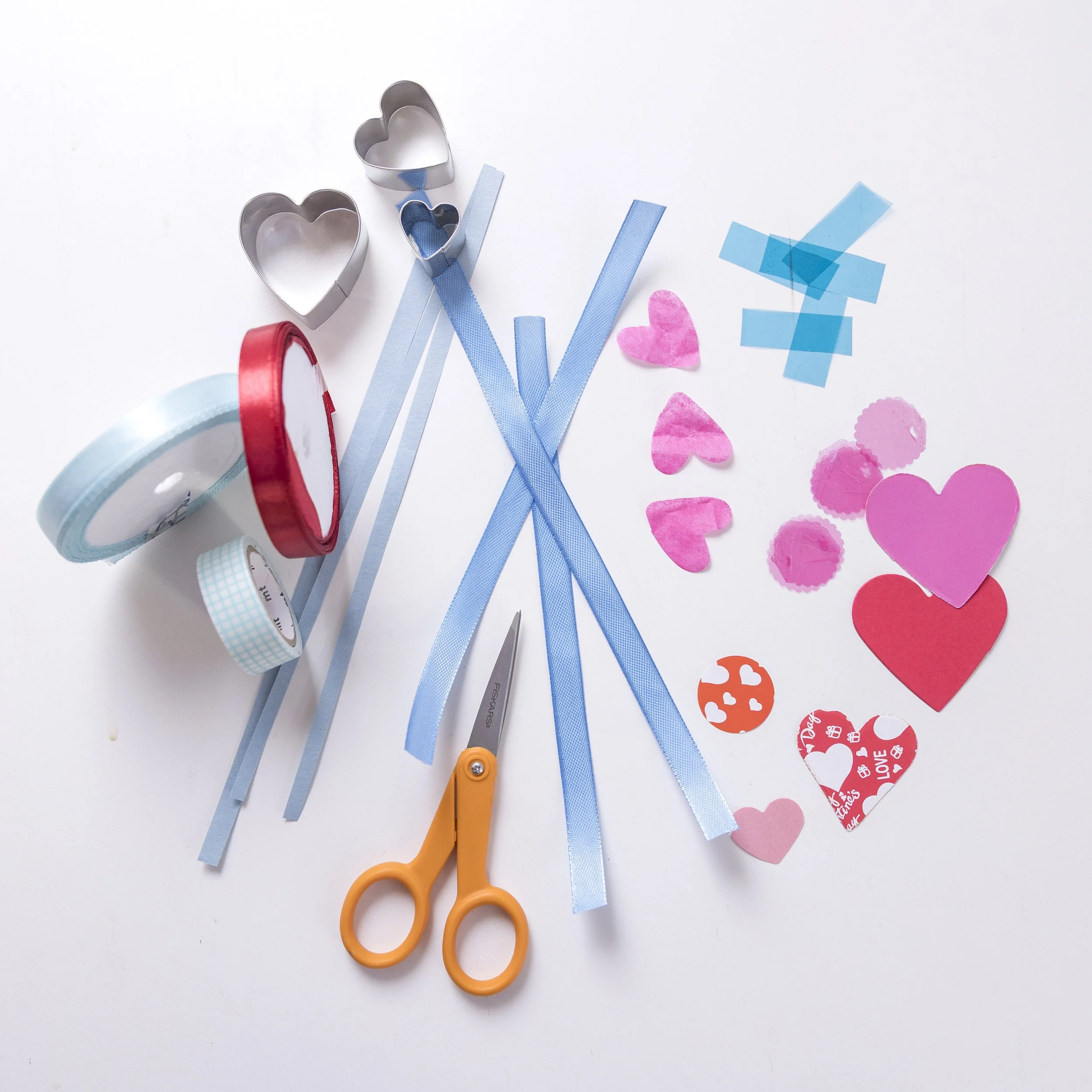 2. Begin by carefully using scissors to cut out strips of paper from your recycled paper (could use newspaper here!) and some shapes from colored paper. In this example we used hearts, circles, and rectangles.